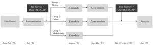 All participants in the hybrid and online study arms attended either the initial training session during Academic Half Day in September 2021 or one of four makeup sessions scheduled between October and December to meet our goal of educating as many residents as possible with equal proportions of PGY-level per study arm group. The initial sessions in September had the highest attendance (15-20 learners per hands-on live in-person and live video groups), while attendance at subsequent makeup sessions was limited due to scheduling conflicts with other educational objectives and clinical duties. Ultimately, three participants in the hybrid study arm and seven in the online study arm were re-assigned to the module-only group due to inability to attend the initial training session or any of the makeup sessions, challenges we will seek to address by staggering small group live in-person training by 6- and 12-week rotation blocks across the current academic year.