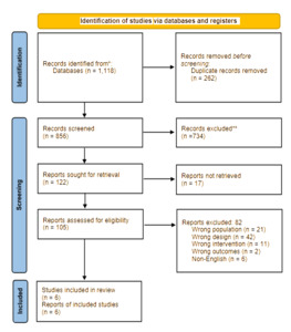 A total of 1,118 records were identified through database searching, of which 262 duplicates were removed, leaving 856 records for title and abstract screening (Figure 1). After screening, 734 records were excluded, and 122 full-text articles were assessed for eligibility. Seventeen full texts could not be retrieved, and 82 articles were excluded for reasons including wrong population (n = 21), wrong design (n = 42), wrong intervention (n = 11), wrong outcomes (n = 2), and non-English language (n = 6). Ultimately, six studies met the inclusion criteria and were included in the final analysis.